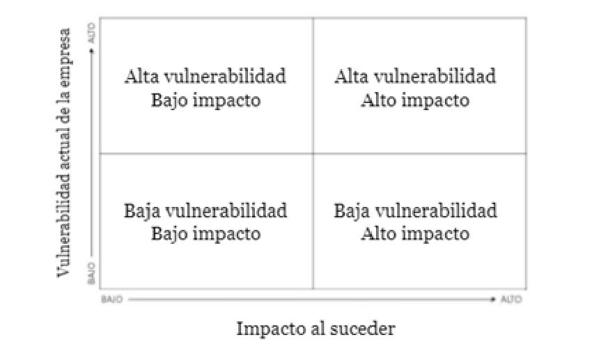 Respecto de los riesgos residuales, ante una baja vulnerabilidad y un bajo impacto será necesario reubicar recursos; ante una baja vulnerabilidad y un alto impacto tendremos que reasegurar la preparación para el impacto; ante una alta vulnerabilidad y un bajo impacto, evaluar impactos acumulativos; y finalmente, ante una alta vulnerabilidad y un alto impacto, aumentar las medidas de mitigación del riesgo.
