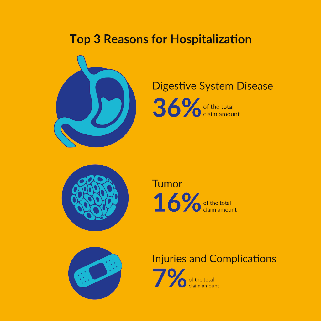 When it comes to hospitalization, trends from 2022 continued, with digestive system diseases (such as colorectal cancer) making up 36% of the total claims amount paid out in 2023. Just like in 2022, this was followed by tumours and injuries and complications, which represented 16% and 7% of the total hospitalizations claims amount, respectively..