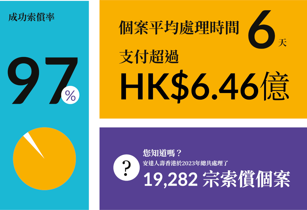 有好的參考,自然懂得選擇更好!我們自豪地宣佈,安達人壽香港在2023年的成功索償率達97%,每個個案處理時間平均只需6天。