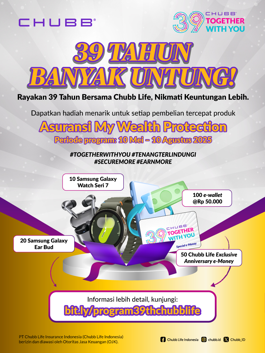 Dalam rangka 39 Ulang Tahun Chubb Life Indonesia, khusus untuk Anda nasabah Chubb Life Indonesia, dapatkan beragam hadiah untuk setiap pembelian tercepat produk Asuransi My Wealth Protection.