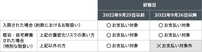 こうした状況変化も踏まえ、発生届の対象とならない方における入院の必要性や今般の政府における措置等に鑑み、2022年9月26日(月)以降診断の「みなし入院」による入院保険金等のお支払い対象を上記のとおり見直すことといたしました。