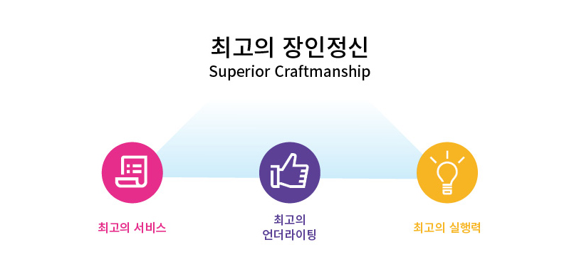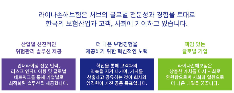 최고의 서비스, 최고의 언더라이팅 전문성 그리고 최고의 실행력으로 최고의 장인 정신을 발휘하는 것이 핵심가치이며, 최고의 장인정신의 모습으로 보험을 개발하고, 보험금을 지급하며, 리스크 관리를 하는데 적용합니다.