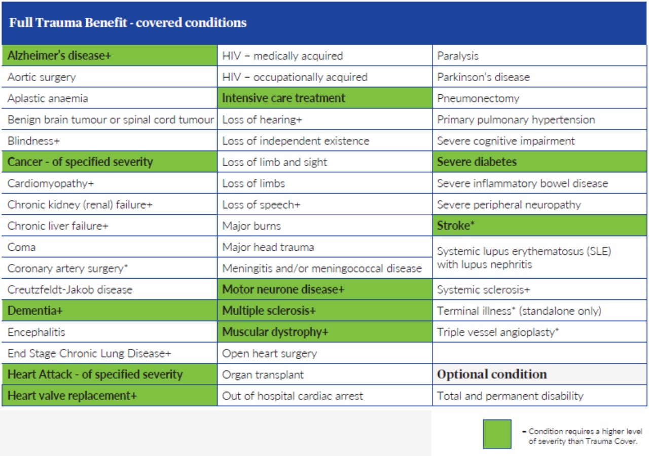 Payment of the full Trauma Cover sum insured if you get a covered condition listed under our Full Trauma Benefit.