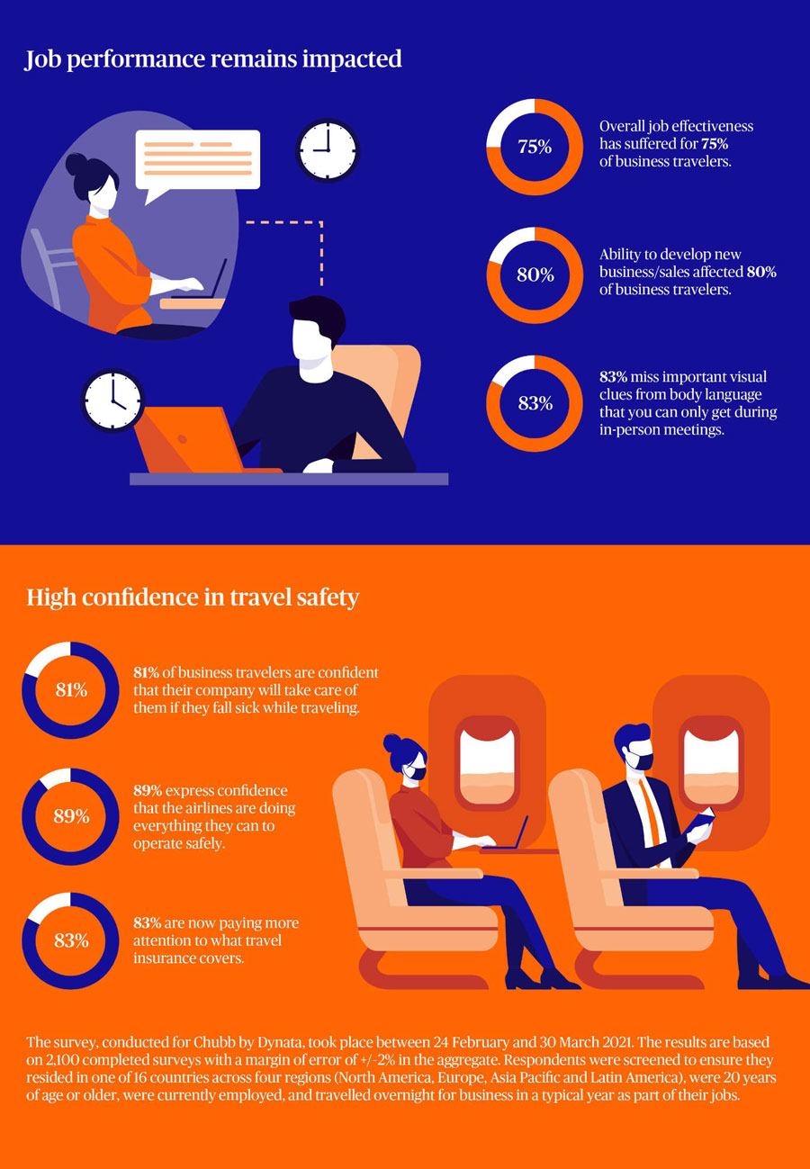 The survey, conducted for Chubb by Dynata, took place between February 24 and March 30, 2021. The results are based on 2,100 completed surveys with a margin of error of +/–2% in the aggregate. Respondents were screened to ensure they resided in one of 16 countries across four regions (North America, Europe, Asia Pacific and Latin America), were 20 years of age or older, were currently employed, and travelled overnight for business in a typical year as part of their jobs.