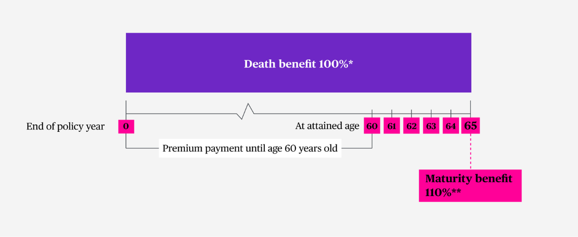 Get yourself ready for retirement with Retirement Savings plan, that provides a lump sum payout at maturity, allowing you to spend the rest of your life confidently, while also let you choose the premium payment either up to age of 55 or 60 years old.