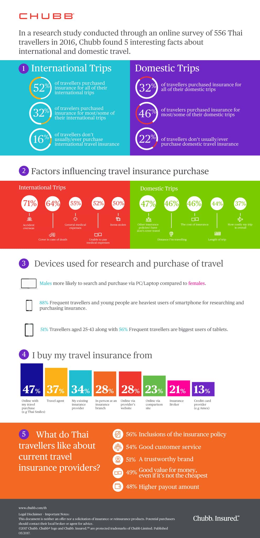 Chubb conducted research on the travel market in Thailand to find out the travel behaviour and insurance purchase habits of Thai travellers. Five hundred and fifty-six respondents participated in the online survey conducted over two days. 64% od respondents are in Bangkok and Central area.