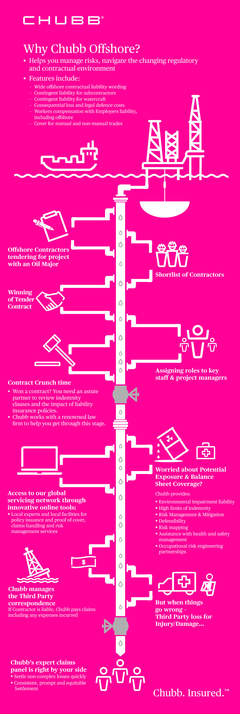 ชับบ์คือผู้เชี่ยวชาญที่มากด้วยประสบการณ์ในการรับประกันภัยความรับผิดสำหรับการปฎิบัติงานนอกชายฝั่งทะเล เรามีความชำนาญในการนำเสนอความคุ้มครองที่ครอบคลุมต่อความเสี่ยงภัยต่างๆ ที่ผู้ให้บริการหรือจัดหาบริการสำหรับธุรกิจเกี่ยวกับน้ำมันและก๊าซธรรมชาติต้องเผชิญ ชับบ์มีผู้เชี่ยวชาญด้านการจัดการสินไหมทดแทนและการให้คำปรึกษาเกี่ยวกับความเสี่ยงภัยต่างๆ จึงสามารถให้ความช่วยเหลือหรือคำปรึกษาแก่ลูกค้าได้อย่างรวดเร็วและเหมาะสม เพื่อให้คุณสามารถดำเนินธุรกิจต่อไปได้อย่างราบรื่น