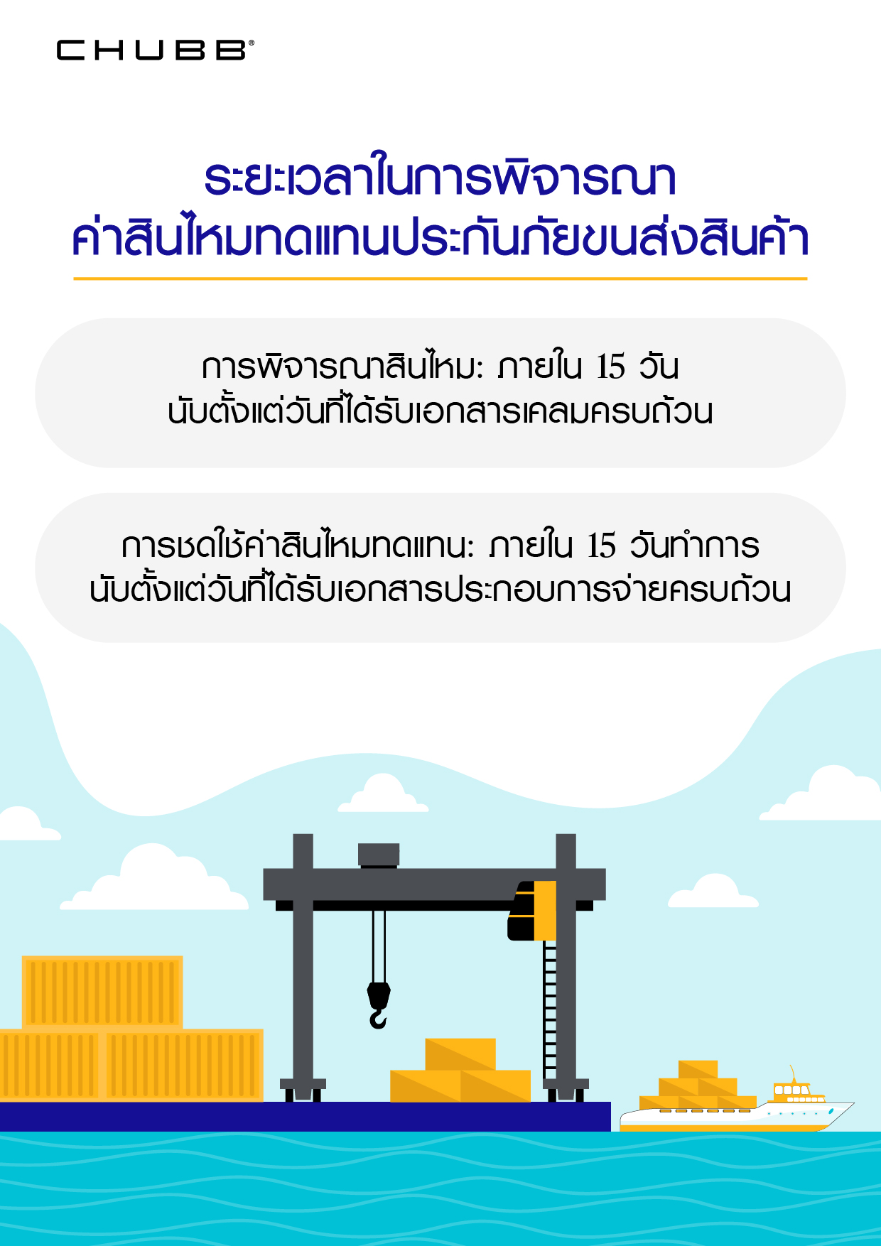 โดยปกติจะใช้เวลาในการพิจารณาค่าสินไหมทดแทนประกันภัยขนส่งสินค้าและทางทะเลนับจากวันที่ได้รับเอกสารที่ถูกต้อง และครบถ้วนเป็นที่เรียบร้อย ภายใน 15 วันทำการ และชดใช้เงินค่าสินไหมทดแทนภายใน 15 วันทำการ นับจากวันที่บริษัทได้รับเอกสารประกอบการจ่ายที่ถูกต้อง และครบถ้วนเป็นที่เรียบร้อย