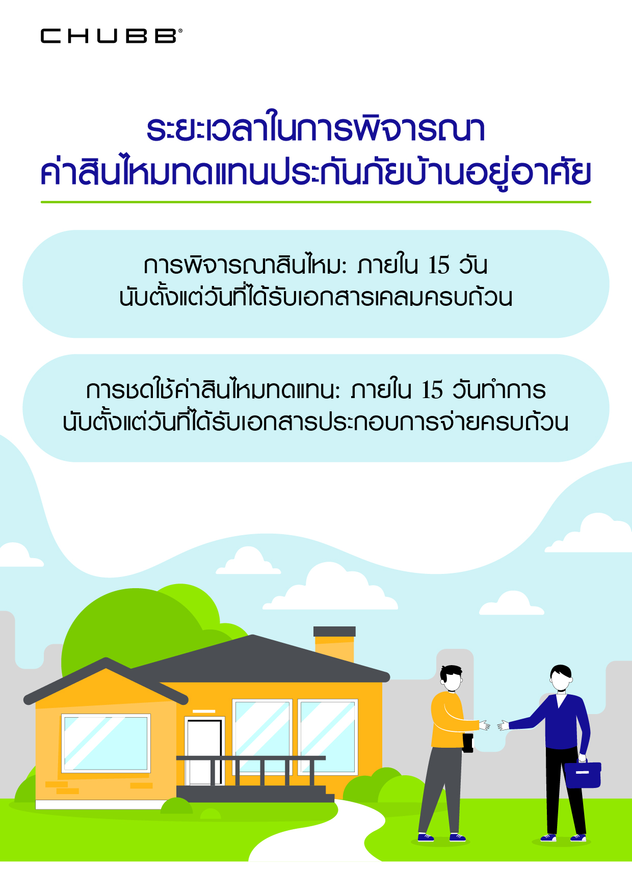 โดยปกติจะใช้เวลาในการพิจารณาค่าสินไหมทดแทนประกันภัยบ้านอยู่อาศัย และ SME นับจากวันที่ได้รับเอกสารที่ถูกต้อง และครบถ้วนเป็นที่เรียบร้อย ภายใน 15 วันทำการ และชดใช้เงินค่าสินไหมทดแทนภายใน 15 วันทำการ นับจากวันที่บริษัทได้รับเอกสารประกอบการจ่ายที่ถูกต้อง และครบถ้วนเป็นที่เรียบร้อย