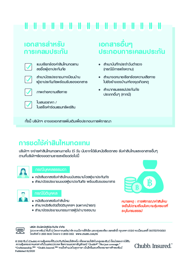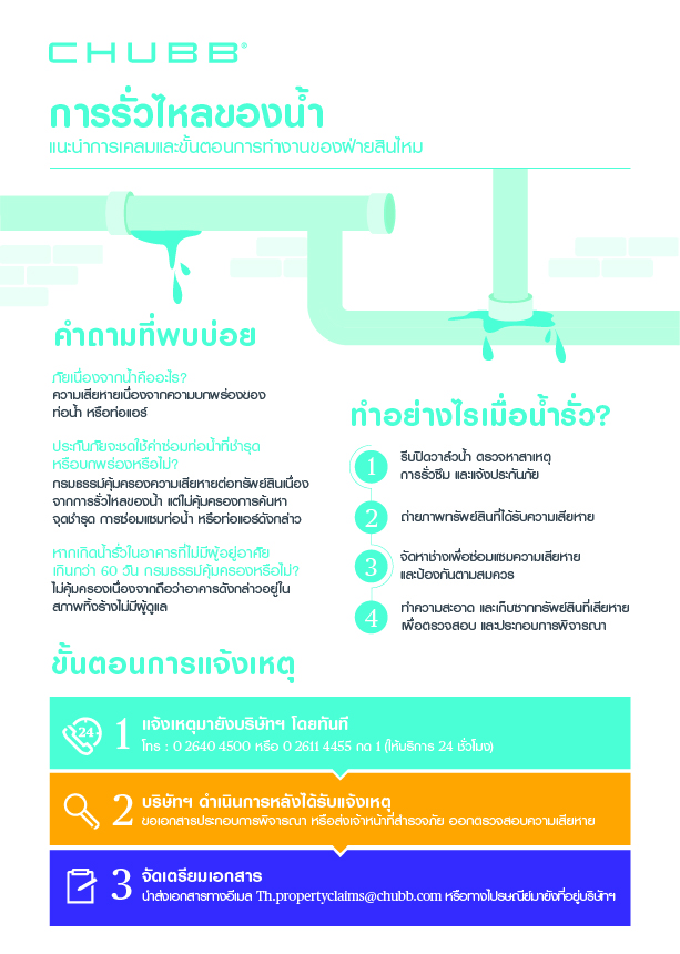 ประกันภัยบ้านอยู่อาศัย และ SME จากชับบ์ คุ้มครองไปถึงทรัพย์สินที่เสียหายจากน้ำรั่วไหล เช่น น้ำรั่วจนทำให้ฝ้าเพดานพัง ท่อประปาแตกจนทำให้ของใช้ในบ้านชำรุดเสียหาย หรือพื้นไม้ถูกน้ำขังจนบวมและโก่งงอ