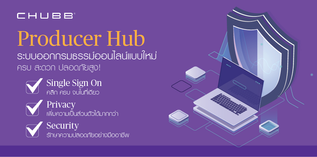 Producer Hub ศูนย์รวมระบบการออกกรมธรรม์ออนไลน์ - เป็นแพลตฟอร์มออนไลน์เชิงกลยุทธ์ที่สร้างขึ้นเพื่อสนับสนุนช่องทางการจัดจำหน่ายผ่านพันธมิตรธุรกิจและตัวแทนของเรา แพลตฟอร์มที่พัฒนาใหม่นี้ถูกออกแบบให้ง่ายต่อการเข้าสู่ระบบ การสร้างใบเสนอราคาและการออกกรมธรรม์ออนไลน์ให้กับลูกค้าของท่านในเวลาที่ท่านต้องการ การนำเสนอผลิตภัณฑ์ประกันภัยที่หลากหลาย ไม่ว่าจะเป็นประกันภัยรถยนต์ ประกันภัยอุบัติเหตุส่วนบุคคล ประกันอัคคีภัยที่อยู่อาศัย ประกันภัยทรัพย์สินธุรกิจรายย่อย ประกันภัยทางทะเลและขนส่ง และ ประกันภัยการเดินทาง