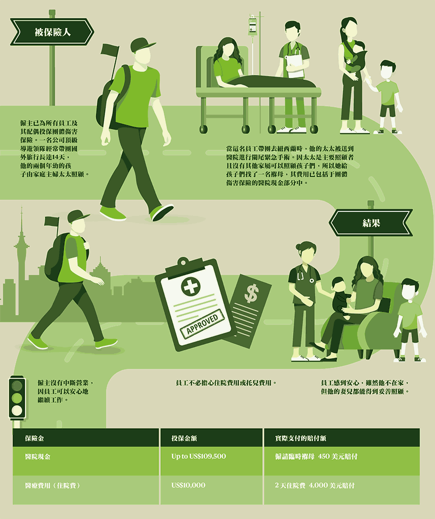 僱主為僱員及其配偶投保了團體人身意外傷害保險。當僱員在海外帶團時,他的太太必須住院。根據保單利益,他提出索賠要求安排一名保育員來照顧他年幼的孩子們,而他則無需返回家里。