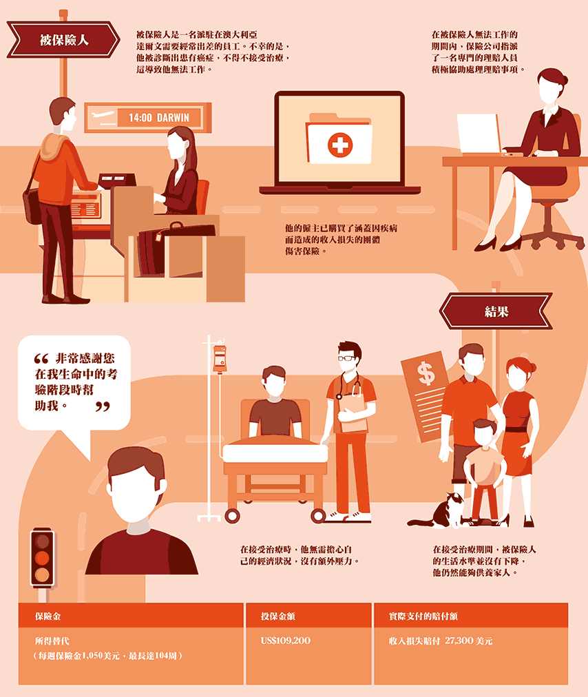 被保險人是一名駐扎在澳大利亞達爾文的飛進飛出(fly-in fly-out)(礦區)工人。不幸的是,他被診斷出患有癌症,必須接受治療。因他所在的公司投保了涵蓋因疾病而造成的收入損失的團體人身意外傷害保險,因此他能夠繼續供養家人且不用降低生活標準。