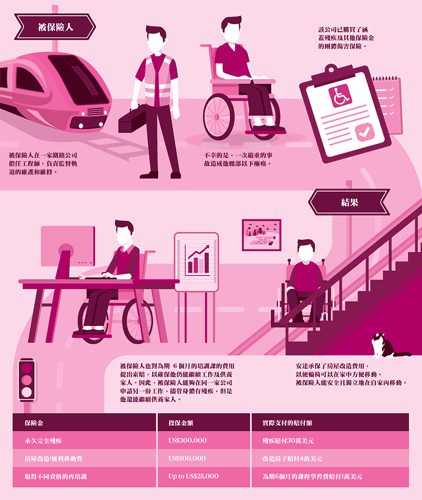 被保險人因腰部以下癱瘓獲得了一筆一次性賠付金,因他所在的公司投保了涵蓋永久完全殘疾的團體人身意外傷害保險。另外,他還能對自家房屋改造和再培訓提出保險理賠,之後他找到了一份新的工作。