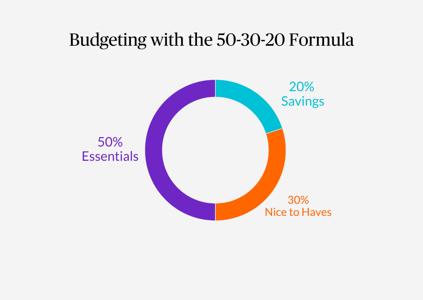 Before you can think about how to save for the future, you need to first organise your income. Start by dividing your income into what you want to spend and what you want to save. A useful rule of thumb is the 50-30-20 formula, which breaks your down into three categories: