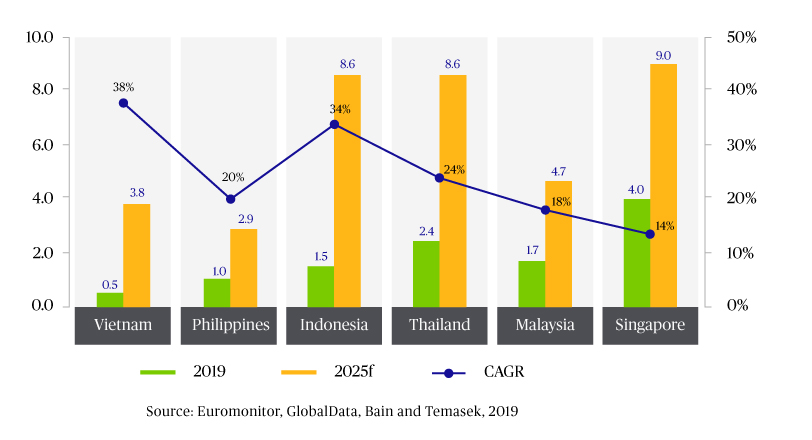 Tôi đã đề cập đến 51 triệu điện thoại thông minh, nhưng bạn có biết có 68 triệu người dùng internet ở một quốc gia 98 triệu dân2 không? Báo cáo tìm kiếm của Google³ cho thấy mức tăng trưởng hàng năm của lĩnh vực bán lẻ và tìm kiếm trực tuyến ở Việt Nam là 100%. Điều này có thể chuyển thành tiềm năng to lớn trong không gian ngân hàng kỹ thuật số và ví điện tử. Tuy nhiên, chỉ có 30,8% người Việt Nam có tài khoản ngân hàng theo Chỉ số Findex Toàn cầu⁴, có một khoảng cách lớn giữa khả năng và tài chính. Hãy xem dự báo tăng trưởng doanh thu dịch vụ tài chính kỹ thuật số ở các nước Đông Nam Á dưới đây, nơi Việt Nam dẫn đầu về Tốc độ tăng trưởng hàng năm (CAGR) -