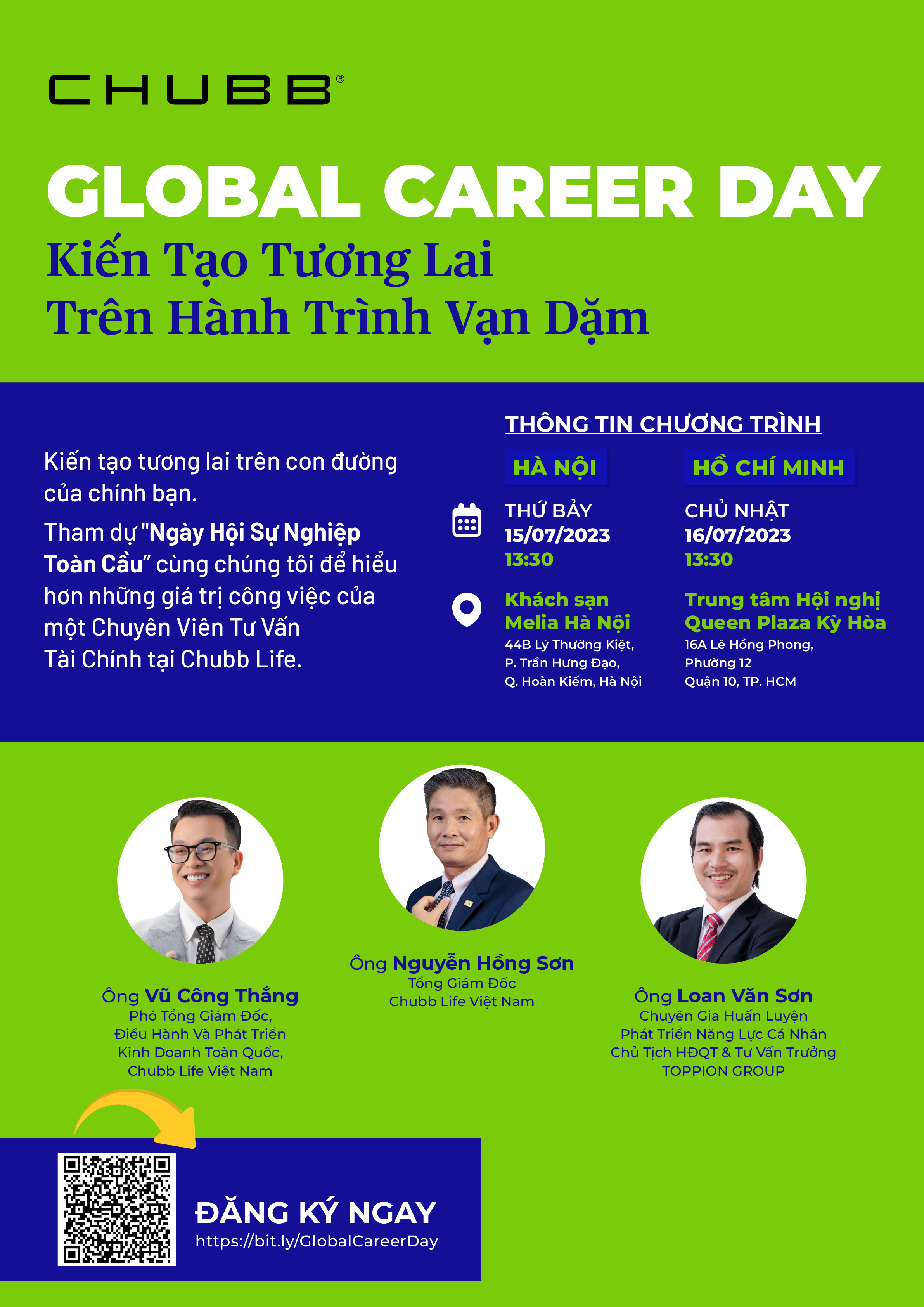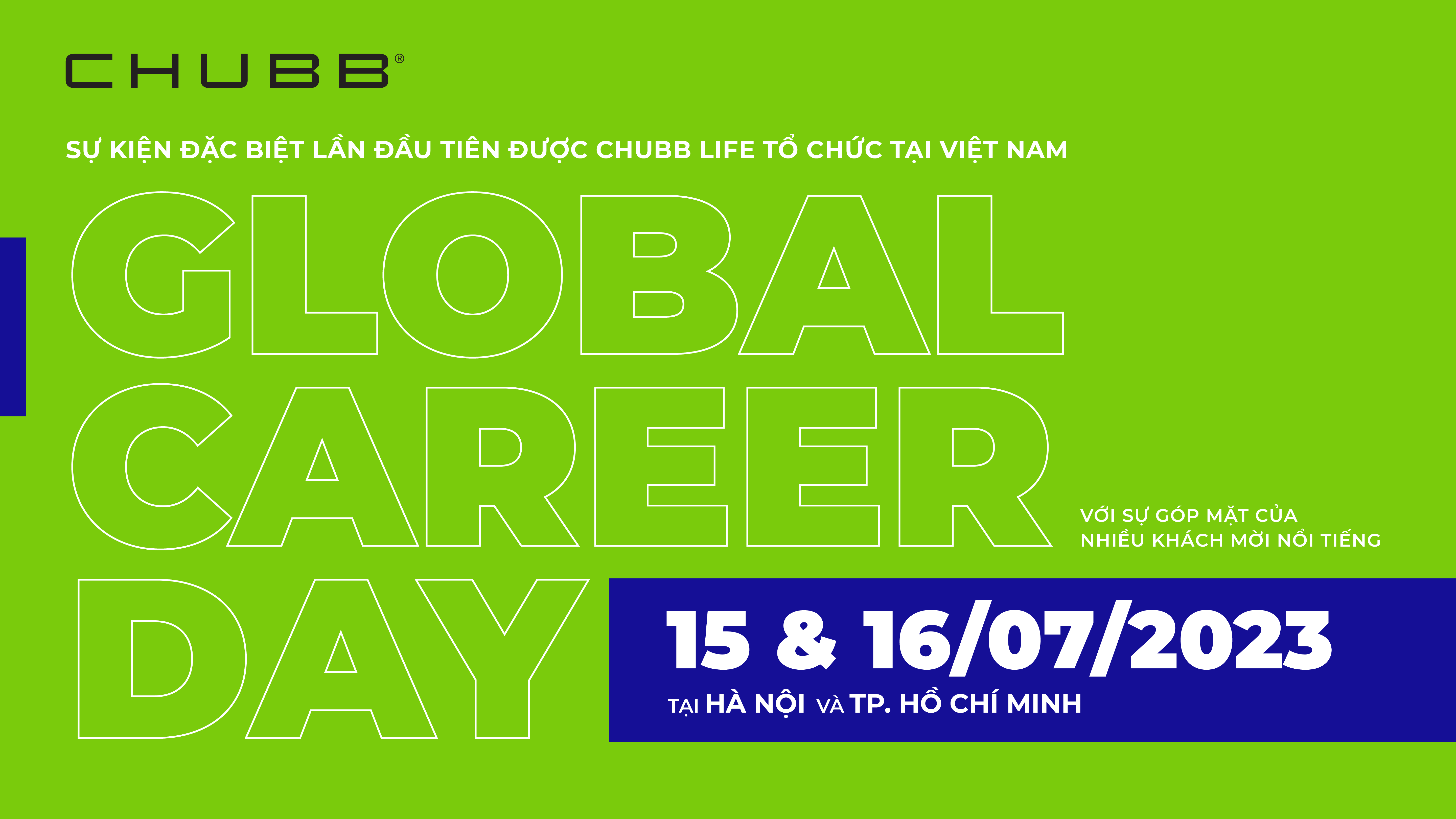 Chương trình “Ngày hội sự nghiệp toàn cầu” là một trong những sự kiện tuyển dụng lớn nhất năm 2023 do Tập đoàn Chubb tổ chức trên phạm vi toàn cầu 6 quốc gia tại Châu Á nhằm thúc đẩy niềm đam mê và giúp bạn tỏa sáng hơn trên hành trình xây dựng nghề nghiệp một cách bền vững.