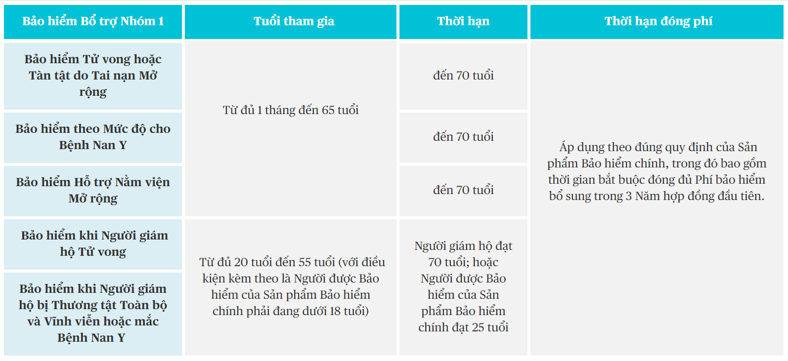 Từ Ngày hiệu lực Hợp đồng Bảo hiểm đến khi Người được Bảo hiểm đạt 65 tuổi |